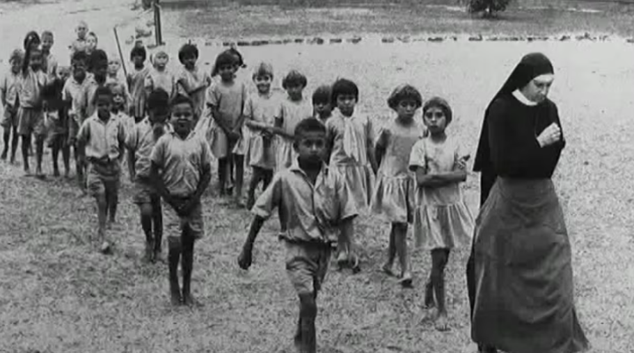 - A nun leading children to march at the New Norcia Mission (Supplied: Dumbartung Aboriginal Corporation)
